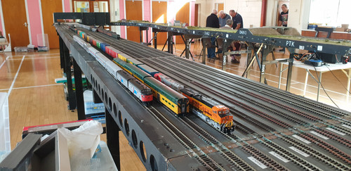 The HO group tried a new 7 x 2 setup, without signals and Ethanol Buildings because there was no control panel created yet. We made use of our (long time in storage) additional x2 staging modules, moving the “Dan” modules from the outer sides onto the opposite straight.