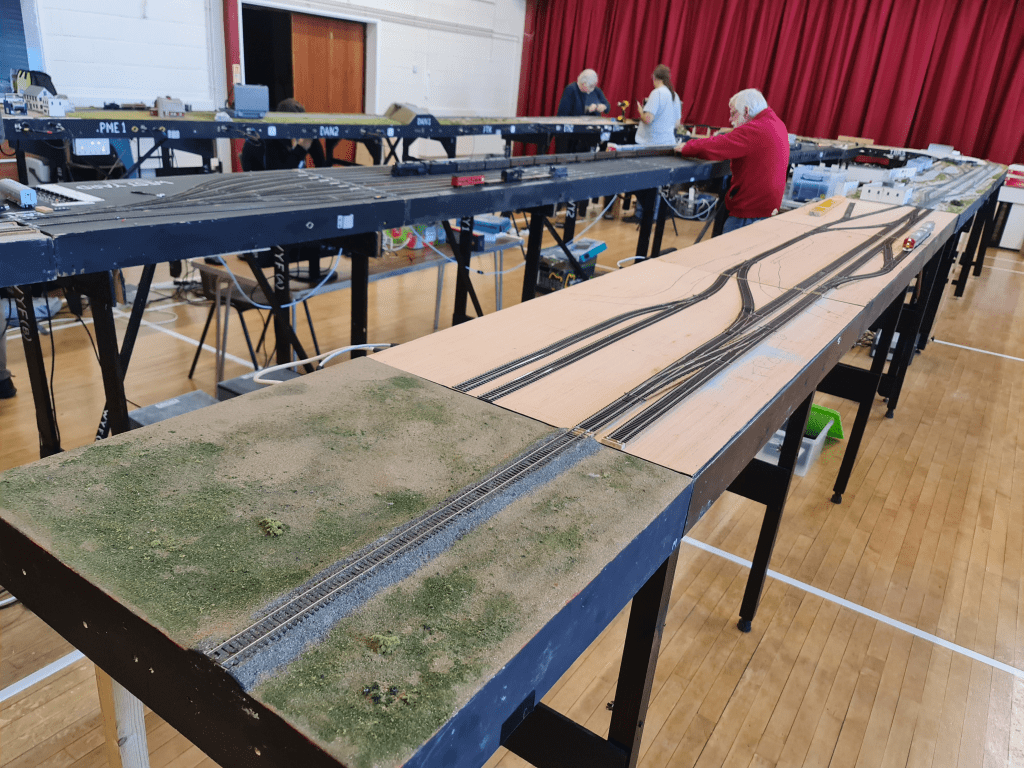 Extended from a two-board setup originally named Lonestar, introducing the other industries at the right hand end (Laxton Transload and Gillard Scrap). The two tracks either side of the single track main were adjusted to serve as passing loops or a run round, and then later on during full integration to the general Thamesiders layout and specifications, an additional crossover was added to serve as an additional passing place for run arounds. A shorter board is usually added at the left hand side to serve as a lead, caboose or loco set out, however for setups like the End to End at the Berkshire Special, one of the straight “Dan” boards were used to provide a longer run.