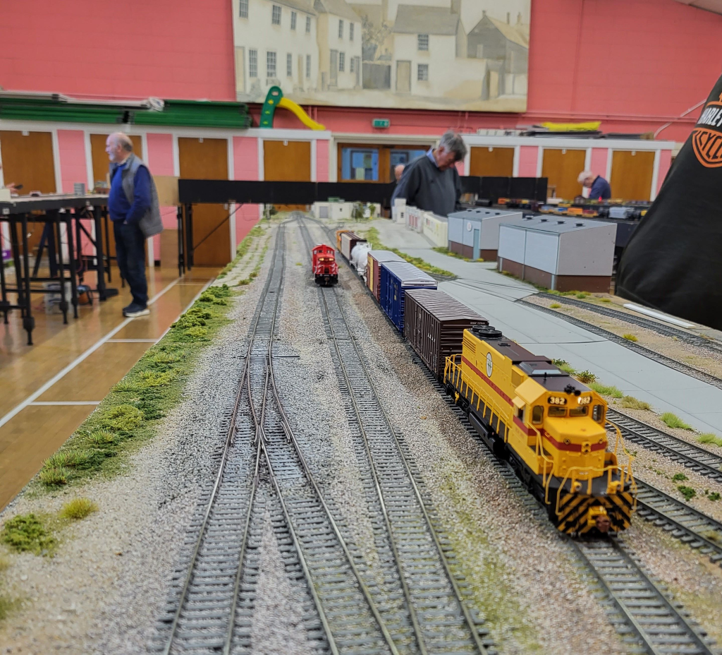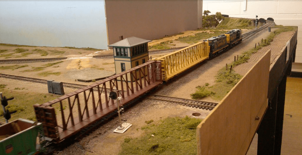 These HO scale modules are a 16’ by 2’ four board set up which provides three run round/passing loops, one on either side of the single track mainline and another at the grade crossing. The following industries are serviceable by rail: Lonestar Cold Store; Laxton Transload Center and Gillard Scrap & Salvage.